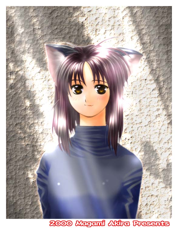 生まれて初めて描いたネコミミ・・・です。 これまた前回の絵と同じゲームのキャラなんですが、年齢設定などは無視して描いているので 体型などはゲームのそれと違います。 ゲーム中はかなりお子さまキャラなんですが、少し落ち着いてきたところ・・・と言った感じです。 ネコミミに関してはかねてから 「一体どこから生えているのか?」「そもそもネコの耳ってどうなってるの??」 などといろいろ解決すべき問題があったのですが取り敢えずその辺はゲームに準じて描いてみました。 さすがにちょっと胡散臭くなった上にそもそも「ネコミミ」って猫の耳が生えていればいいというモノではなくて 雰囲気、キャラのイメージも含めた「種類」なのでは?と思わないでもないのですが そこはそれということで。 もともとはPainter6の試し描き用に描き始めたつもりだったので構図その他凝ってませんが、 背景付けて日の光を入れたらいい感じになったと思ったのでお披露目してみました。 背景はLightwave3Dですがモデリングと言うほどのことはなくて、でかい板をsubdivideで細分化して それに適当にプロシージャルテクスチャを適用してレンダリングした物です。 こういうのは簡単でいいです。 |