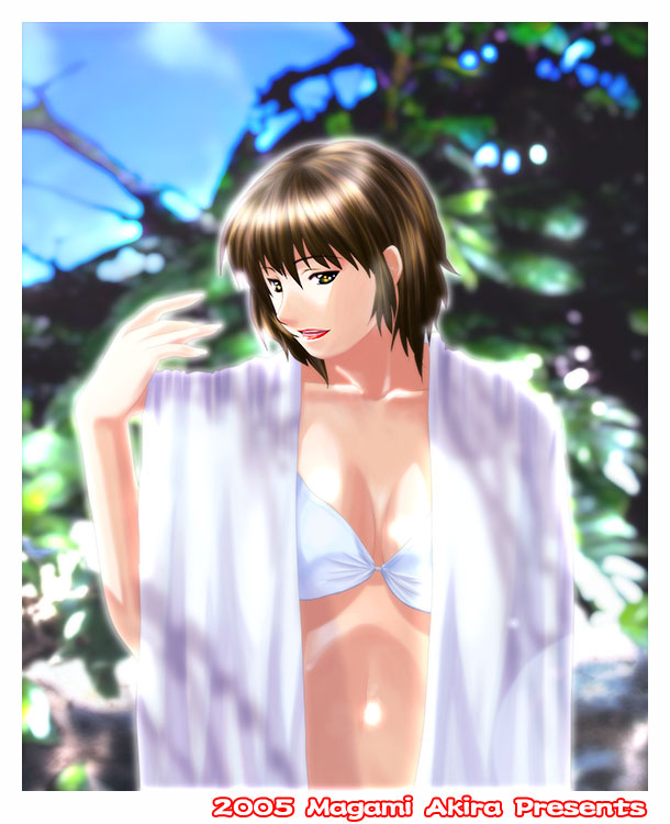 前回の更新が2005年の年賀絵なので実に8ヶ月ぶりの更新です。 去年の秋に描いた絵を延々10ヶ月近くトップに貼り付けていたので心苦しかったです。 PhotoshopCS2も来たし折角だから夏用のトップ絵を描くか・・・と思い立って結構経ってしまいました。 ようやく完成したと思ったらそろそろ夏休みも終わりの時期です。 タイトル自体にはあまり意味がないのですが、夏、空、緑と雲というと何となく本州よりも夏の島の方がイメージとしては近い気がします。 沖縄には行ったことがありませんが、東南アジアの方には何度か行ったことがあるのでどっちかというとあっちの方のイメージですが、こうして絵で見るとあまり違いは出ませんね。 背景は手描きするのが面倒くさかったので実家の庭の暗がり(笑)をデジカメで撮って加工して使いました。 それにバンプをかけた板をざっとレンダリングして砂地のようにして合成してあります。 時間があれば背景は手描きにしたいのですがなかなか・・・と言い続けて結構経ちますね・・・ 自分的には結構珍しいタイプを描いてみたつもりですが、いかがでしょう。 ちょっとお姉さんっぽい感じの絵が描きたかったので。 健康的なお色気って難しいですねぇ・・・